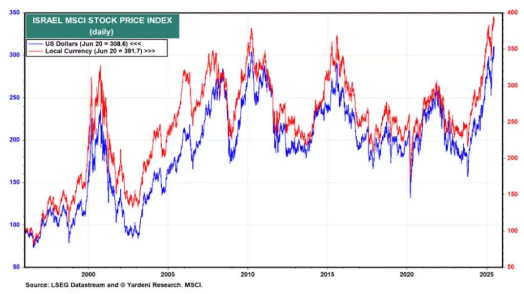 The optimism is most evident in Israel’s own stock market. The Israel MSCI Index has reached record highs, reflecting investor confidence that the regional outlook may be improving. “Predicting Middle East geopolitics is risky,” Yardeni said, “but Israel’s market suggests a potential turning point, especially now that Iran has been de-nuked.”