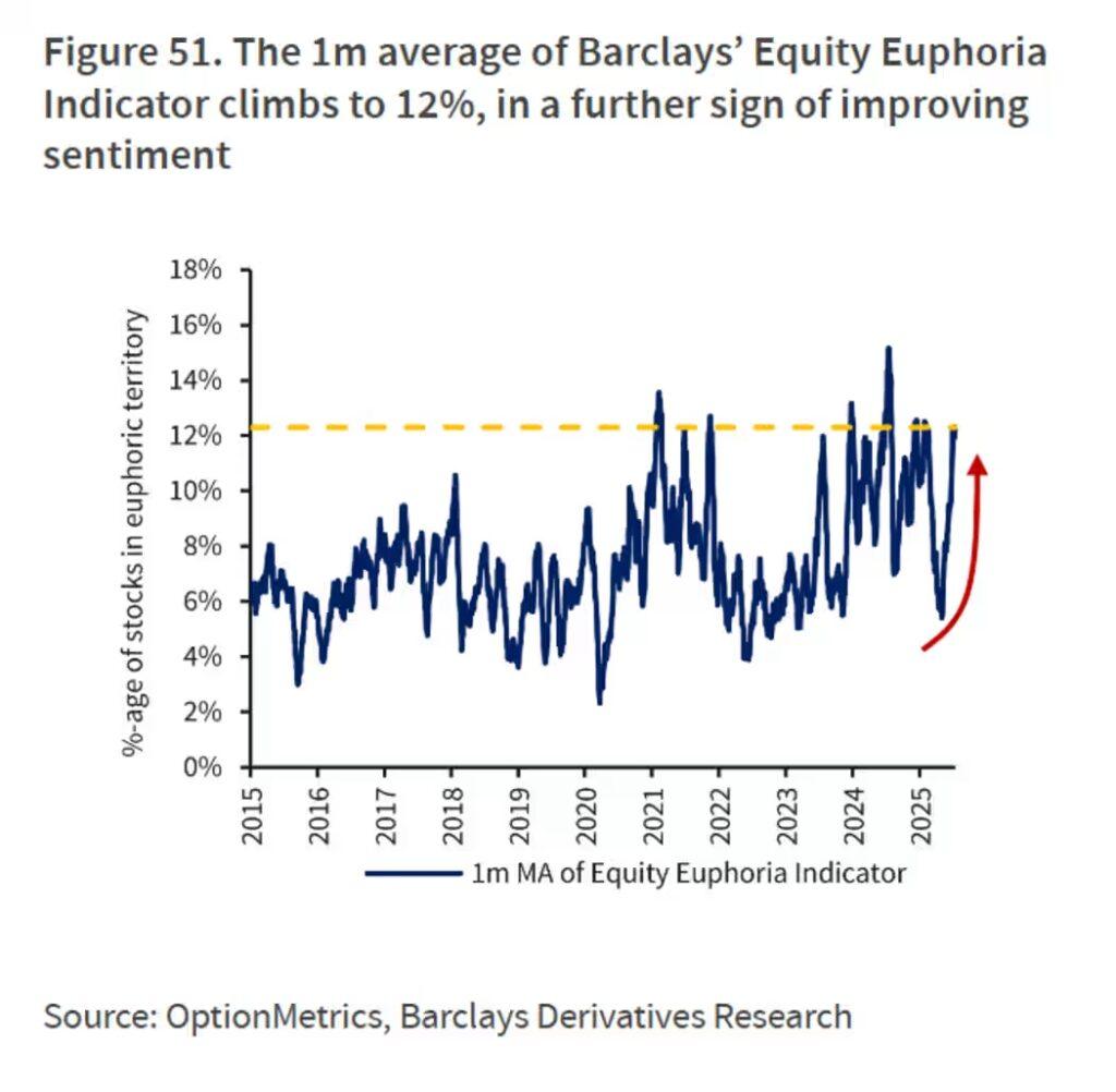 Barclays strategists led by Venu Krishna cite their Equity Euphoria Index, a proprietary gauge that tracks the share of stocks in “euphoric territory.” The index is surging toward its highest level of the year, driven by options activity — particularly the zero-day-to-expiration contracts popular with retail traders.