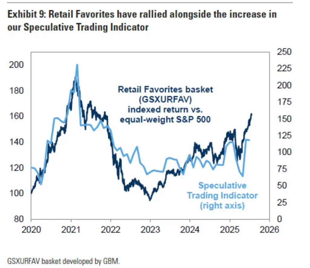 Recent squeezes — like Kohl’s (KSS) and Krispy Kreme (DNUT) — highlight retail traders’ influence, as Goldman notes their “favorites” basket moves in lockstep with the STI.