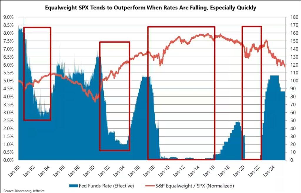 More importantly, Jefferies notes that rate cuts tend to favor the equal-weighted S&P 500, which gives more influence to smaller names outside tech. Historically, most periods of outperformance for equal-weighted stocks have come when the Fed is easing policy.