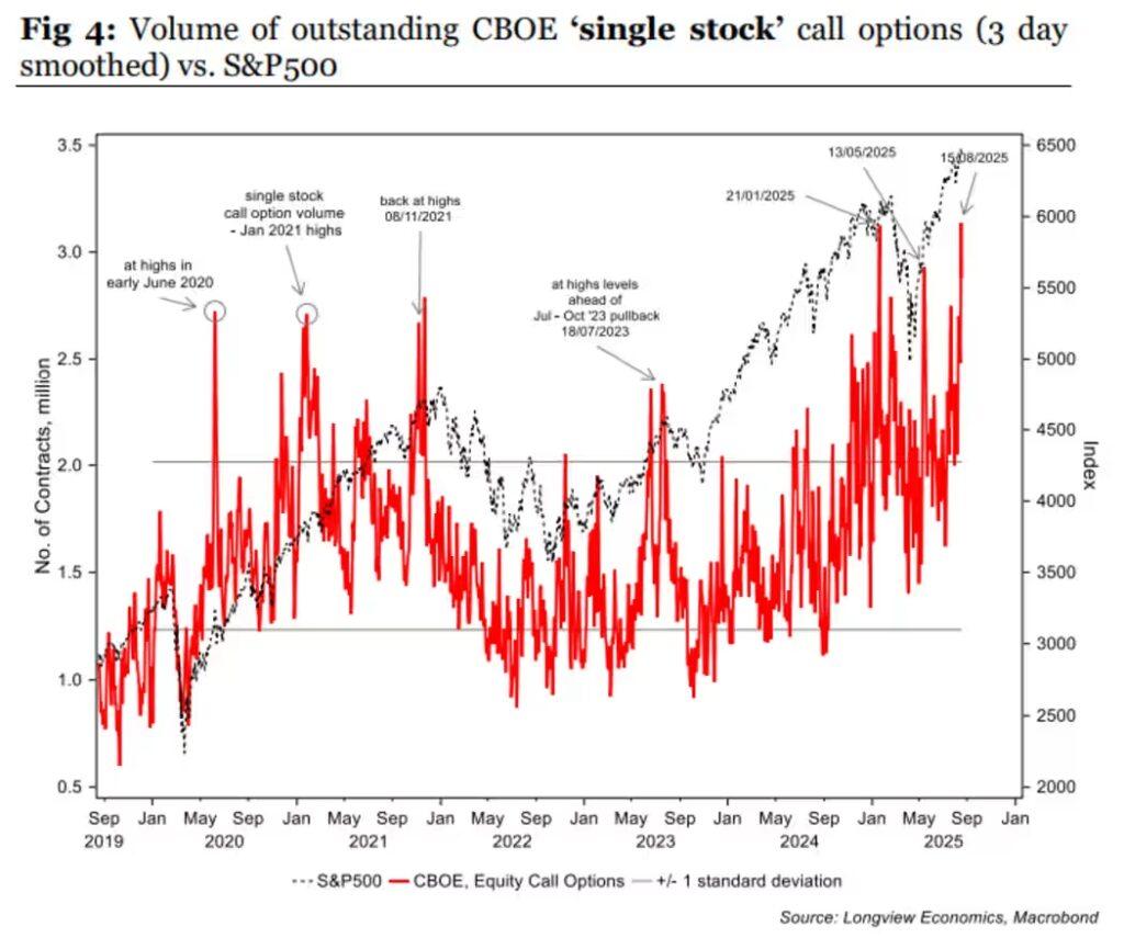 - Speculative options activity — single-stock call option volumes just hit a five-year high, signaling heavy retail speculation and the revival of meme-stock behavior.
