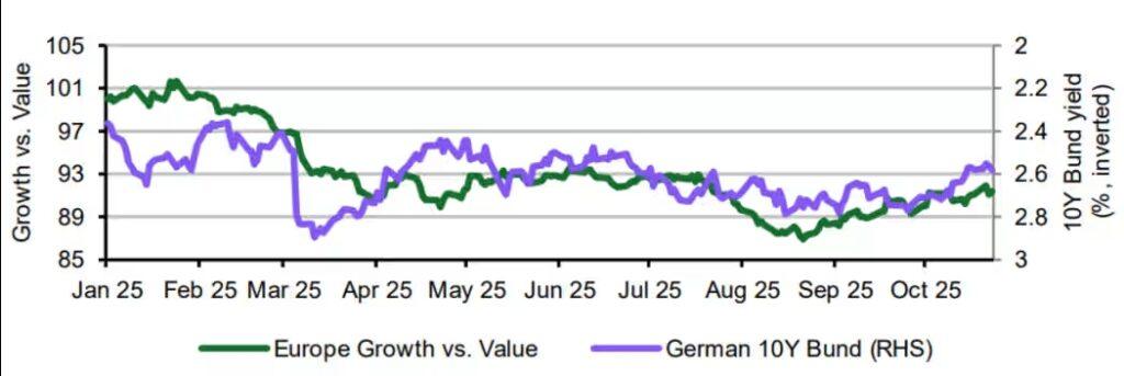 In Europe, easing rates—particularly after recent volatility in France—caused value stocks to underperform growth by 80 basis points in October, marking a reversal of the trend that began in late 2021.