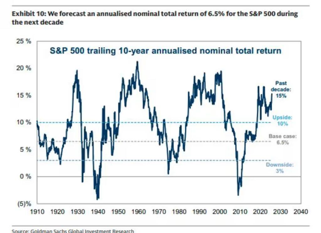 Looking further out, the bank expects the index to deliver a 6.5% annualized return over the next decade — slightly below its 7.7% forecast for global equities and near the 27th percentile of historical returns since 1990.
