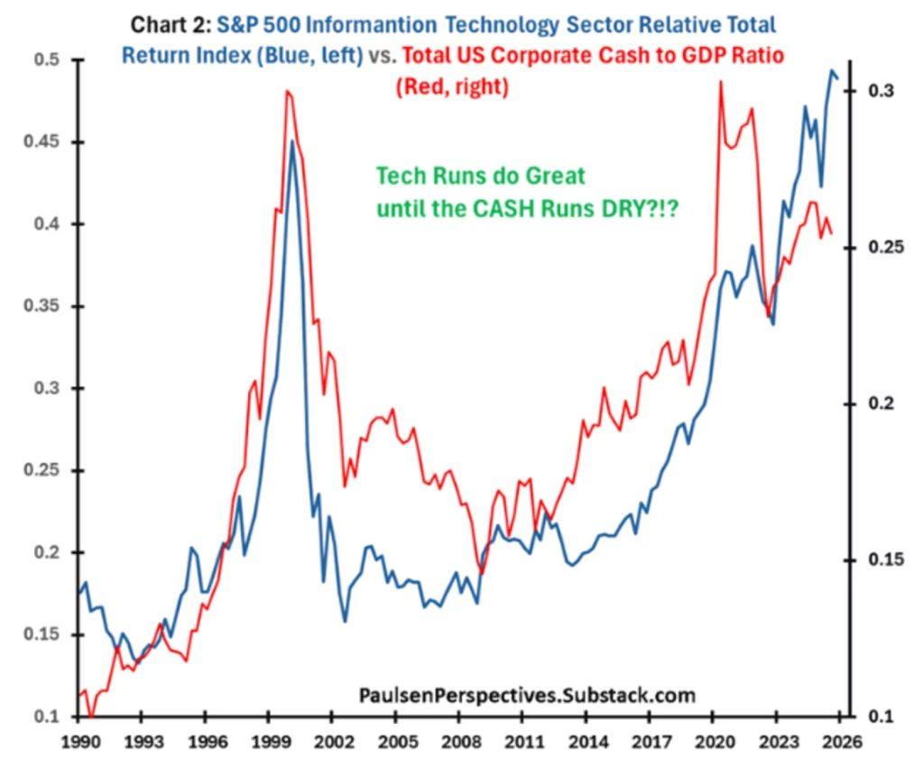 That tailwind may now be fading. The corporate cash-to-GDP ratio peaked at the end of 2024 and has since turned lower. Paulsen expects it to decline further in 2026 as short-term interest rates fall. “When excess cash dries up,” he warns, “the technology boom tends to pause.