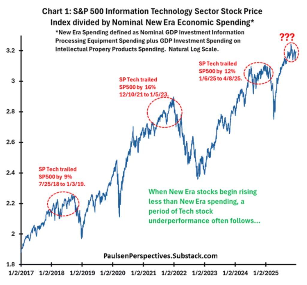 Paulsen stresses he is not calling for a crash. Rather, he believes a growing set of warning signs suggests technology stocks may soon surrender their long-held leadership role.